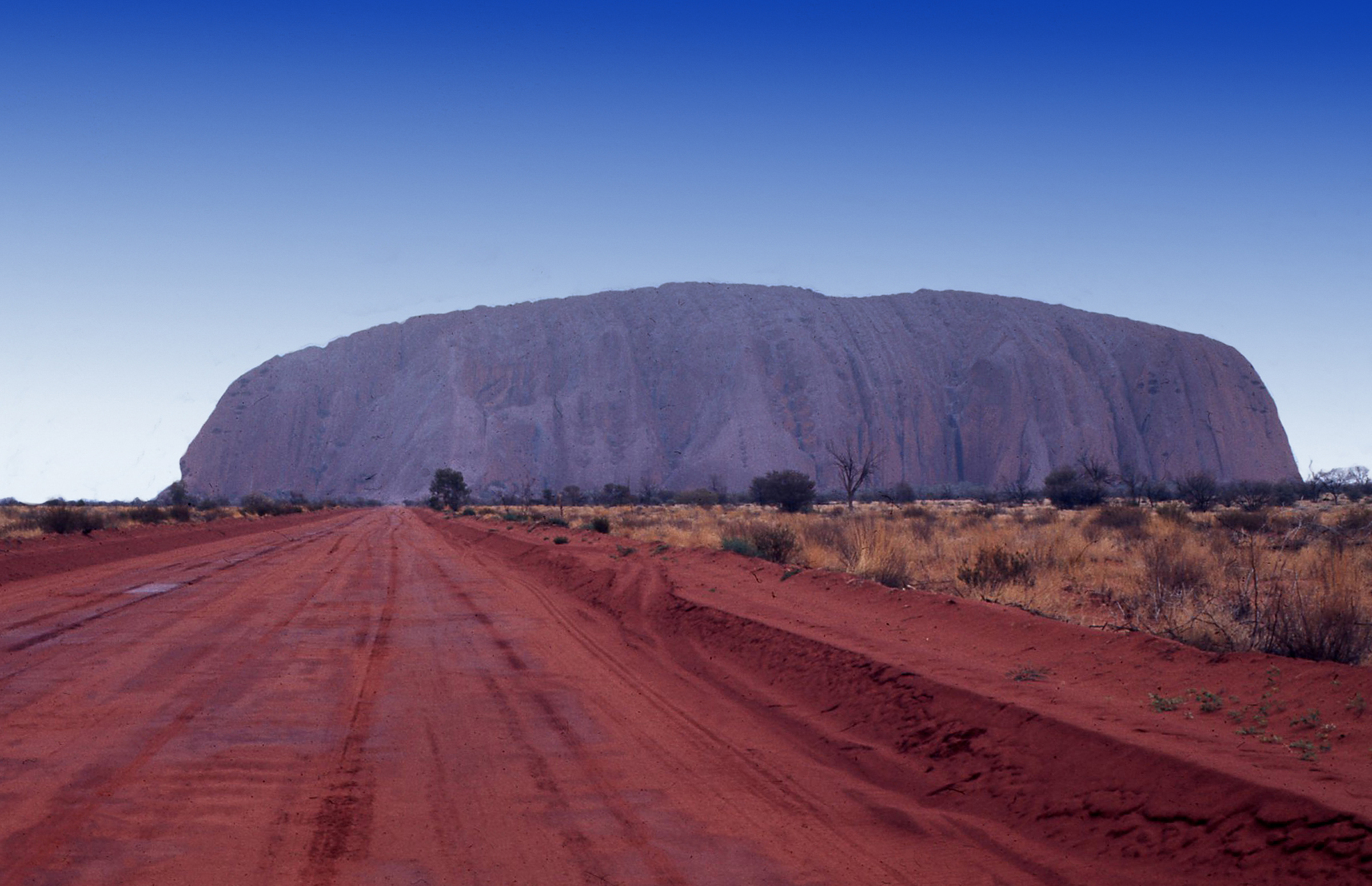 As you can gather from these two images, Uluru is situate in an arid area of Australia. It rains at Uluru on average for only 30 days per annum and these falls give an average of 217 mm( 8.555 inches) of rain per annum.