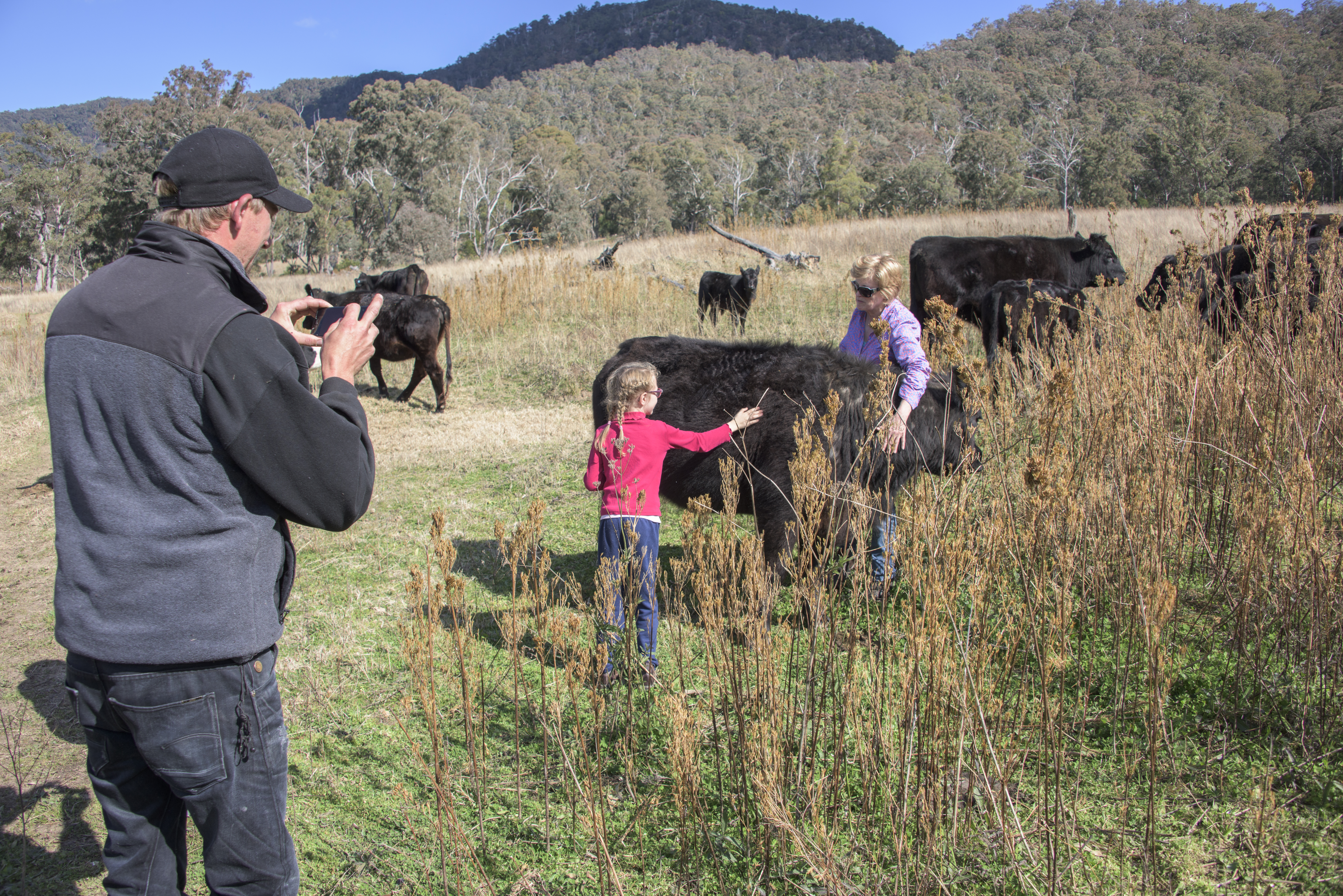 On the way up to Champagne Hill we had passed through a mob of curious Black Angus cattle. Β On the way back down, Robyn invited us to watch her hand feed them with the fodder she had piled roof high in the back of her Defender.