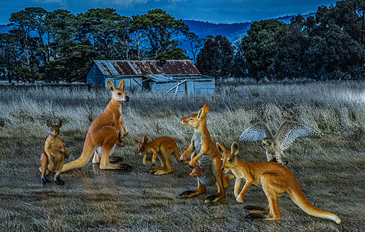 The first two images are from my table top photography collection.The background to the crocodile is the Wollondilly River that flows about half a mile from my house. The crock of course is from my toy collection as is the dinner treat.The second image background is an abandoned shed about 10 miles from home and the roos and eagle are also from the toy collection.